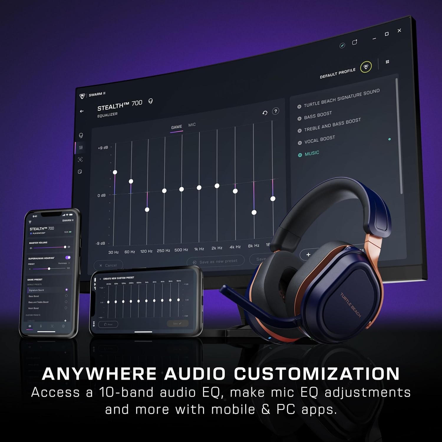 Completely redesigned for the 3rd generation of the Stealth 700, the all-new uni-directional flip-to-mute microphone features A.I. noise reduction to ensure ultra-clear mic quality with the quietest background possible. Using the Swarm II companion app for desktop & mobile devices, you can adjust noise gate, sensitivity, monitoring levels, and choose from four different mic presets, or even make your own with a custom 10-band microphone EQ. And to dial in the 60mm Eclipse drivers to your liking you can use the Swarm II app to cycle through four audio EQ presets, create up to five custom presets with a 10-band audio EQ, adjust game & chat volume mix, chat boost, plus activate, or adjust Turtle Beach exclusive Advanced Superhuman Hearing sound setting. And for added customization, you can remap the wheel & mode button on the headset to different functions to better suit your gameplay.