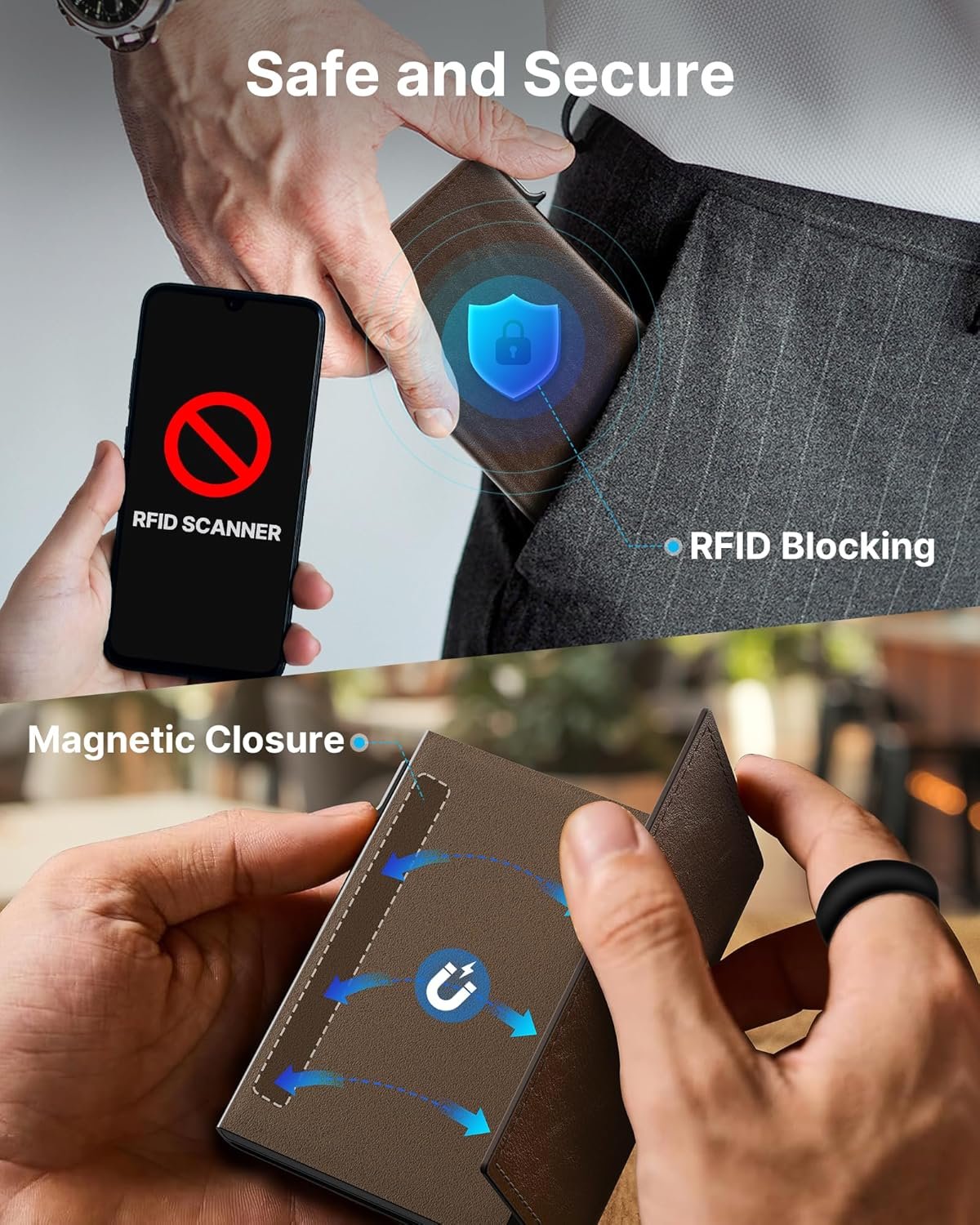 𝗥𝗙𝗜𝗗 𝗣𝗿𝗼𝘁𝗲𝗰𝘁𝗶𝗼𝗻: Protect your cards and personal information with advanced RFID blocking technology, effectively blocking the 13.56 MHz frequency. This ensures that your cards are protected from unauthorized scanning.