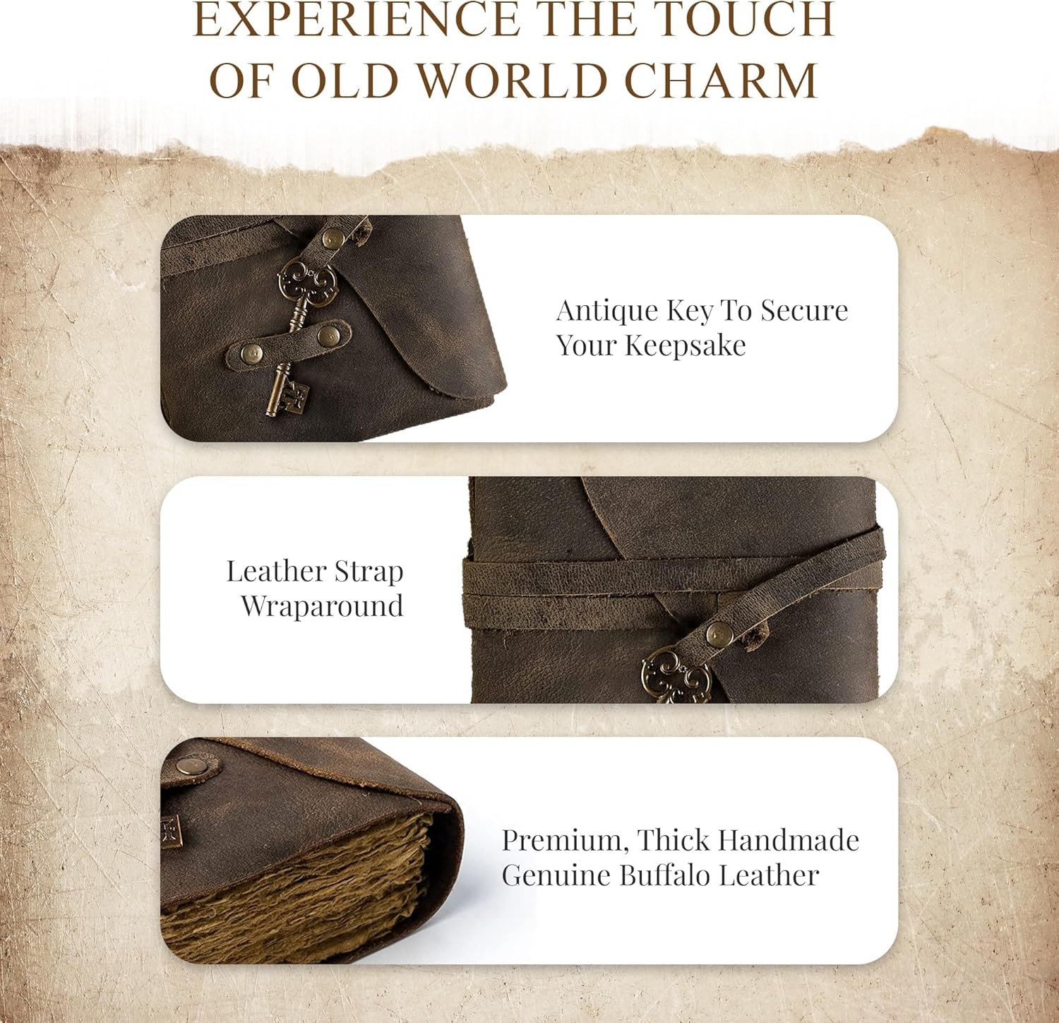 High-Quality Leather Journal That Feels Truly Antique!!! I am genuinely impressed with this journal. The leather feels thick, soft, and beautifully distressed — not stiff or plasticky like some “vintage style” journals can be. It has that rich, earthy leather scent and a sturdy, high-quality feel in your hands. The wrap closure and key detail give it such a unique, old-world character.The pages are what really surprised me. They have that aged, deckled-edge look that feels authentic and rustic, like something you’d discover in an antique shop. The paper has a warm tone that makes writing feel more intentional and creative. It’s lined, but still keeps that handcrafted aesthetic.For around $30, this journal absolutely delivers on quality and price. It looks far more expensive than it is and would make an incredible gift — or a beautiful addition to your own collection if you love vintage, moody, or artistic stationery.Highly recommend if you’re looking for something that feels special, not mass-produced.