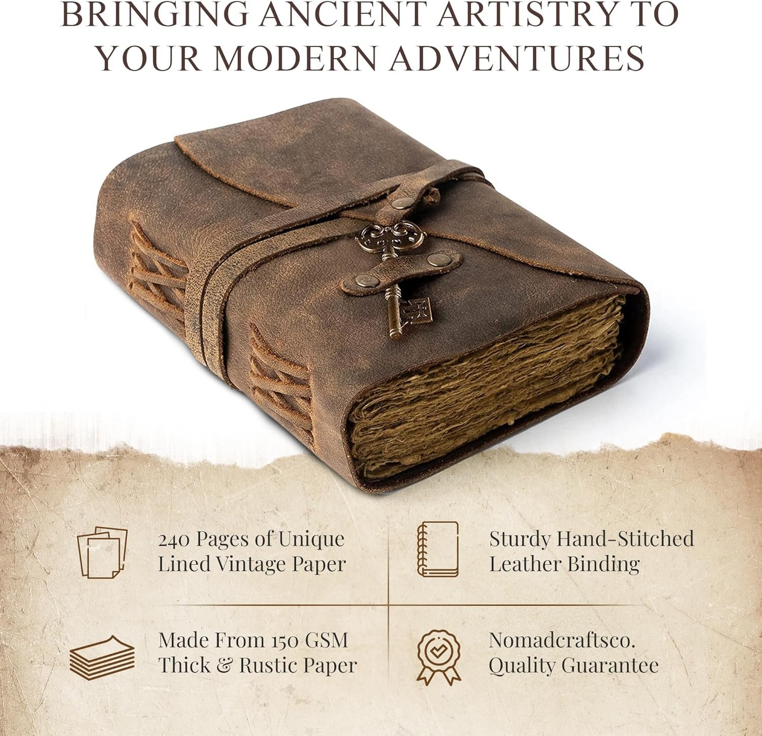 High quality, beautiful design Better than the photos. Larger than you think. The strap/key is perfectly fitted for the journal. Smells like fresh leather, 240 pages is more than you think in your head, especially with the page size. Best journal I’ve ever had in terms of quality has a handmade appearance and feels high quality on the fingers.