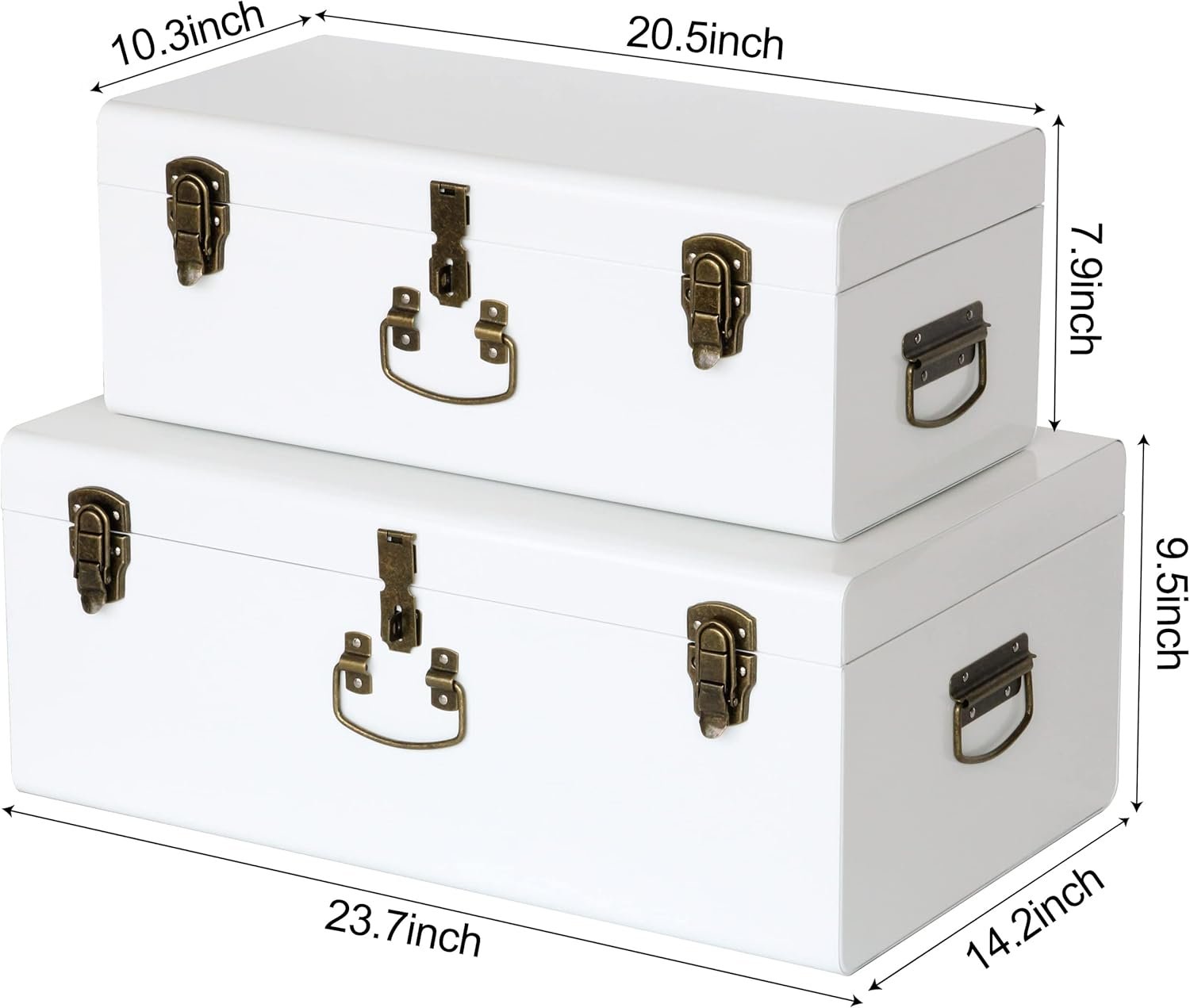 Vixdonos Decorative Metal Box Storage Trunks Set of 2 College Dorm Chest with Handle (White with Bronze Latches)