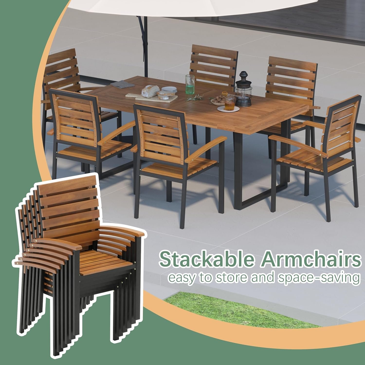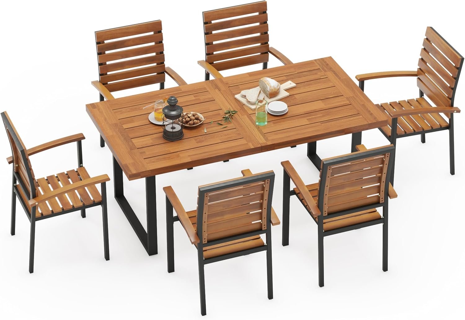 Indoor & Outdoor Versatility—Crafted with a stylish blend of acacia wood and metal, this 7-piece dining set offers a modern yet rustic charm. Perfect for both indoor dinners and outdoor gatherings, it seamlessly complements patios, gardens, porches, dining rooms, balconies, or decks. A great choice for creating a warm, inviting space for relaxation and entertainment.