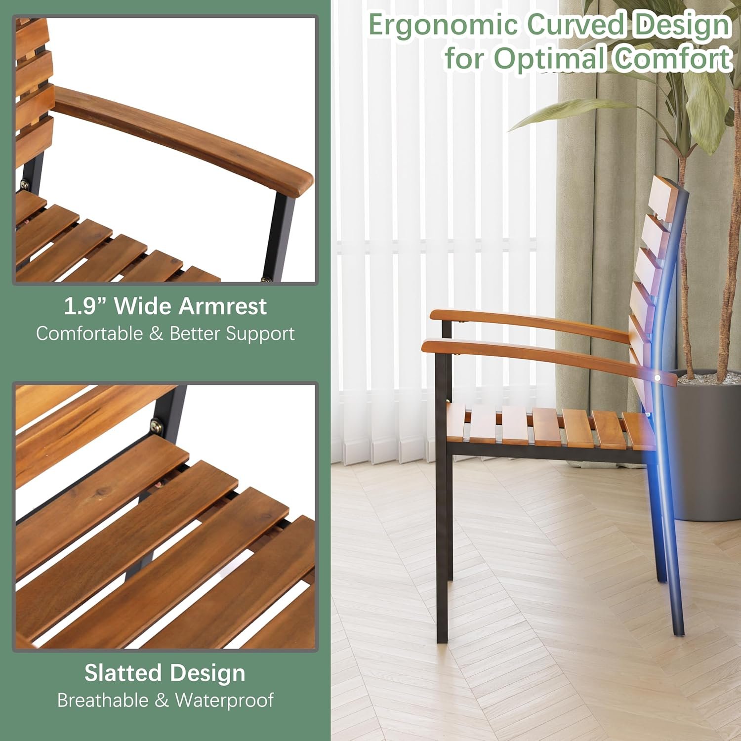 Premium Solid Acacia Wood—The tabletop, chair seats and backs are made from natural solid acacia wood, showcasing fine craftsmanship with excellent durability and load-bearing strength. The waterproof surface enhances longevity, while the open-slat design prevents water accumulation and speeds up drying after rain, adding both beauty and function.