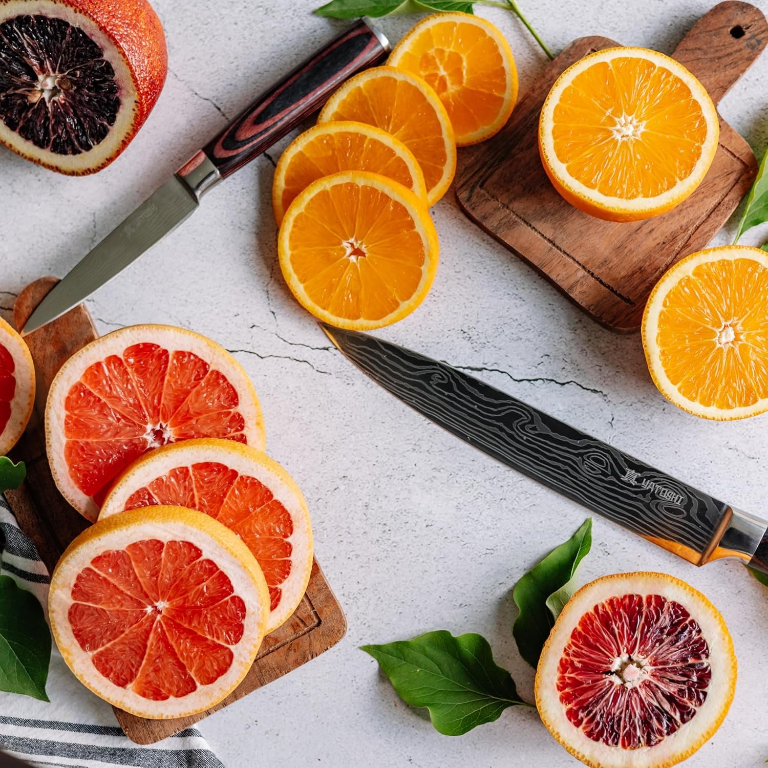High Carbon Blades: Made with premium 7Cr17 High Carbon Steel that provides a razor-sharp professional quality blade. The steel contains 0.6-0.75 carbon, making it two times tougher than other knives in its class with a Rockwell Hardness of 57-58. Each blade is finished with an elegant waved pattern that adds a touch of artistry while highlighting its precision craftsmanship.