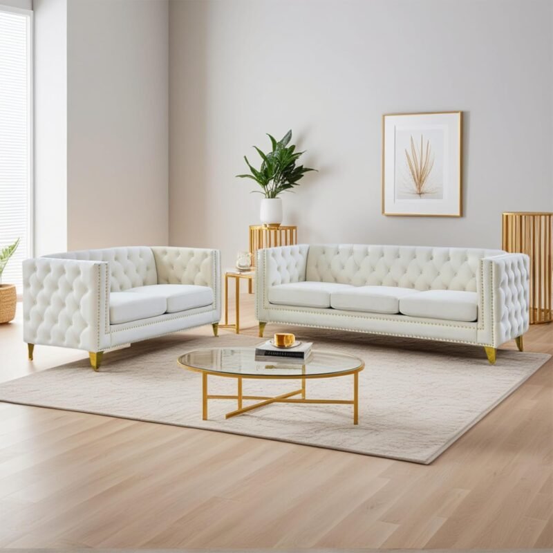 2 Piece Chesterfield Velvet Combination Sofa Set for Living Room,3-Seater and Loveseat Sofa Set Tufted Couch with 4 Pillows,Rolled Arms and Nailhead for Living Room, Bedroom, Office Beige